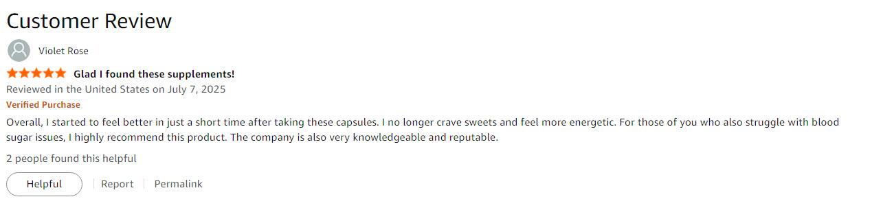 I am a type 2 diabetic and my A1C was creeping up. While I eat pretty healthy, I do enjoy carbs especially sweets. I decided I needed to support my blood sugar with some natural herbs along with my meds. I did some research on which vitamins and herbs could help and I found that this supplement is a great combination of what I need for the money. I've been taking this blood sugar supplement for a few weeks now with no ill effects. I've noticed I have more energy and don't have sugar and carb cravings as much thorughout the day, which is a big plus for me! I'm anxious to get the results from my next blood test. The capsules are easy to swallow with water and there's no strange taste or small. I am happy with the product and I am going to keep taking it! (Verified Customer)